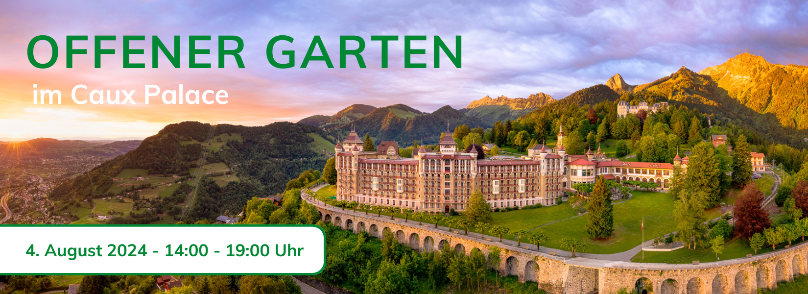 Geniessen Sie einen festlichen Moment in den wunderschönen Gärten des Caux Palace, einem historischen Bauwerk mit einer der schönsten Aussichten des Lemanbogens.
