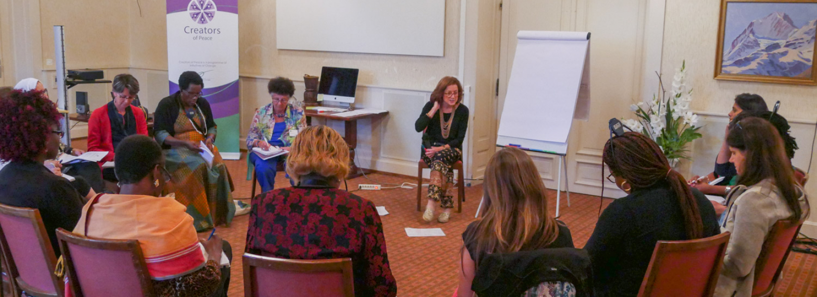 Am selben Tag fand eine bereichernde Veranstaltung mit sieben der Gründungsmitglieder von Creators of Peace statt, die 1991 die erste CoP-Konferenz organisierten, an der 700 Menschen teilnahmen. Ahunna Eziakonwa aus Nigeria, Vijaylakshmi Subarmanyan aus Indien, Paige Chargois und Tata Mbugua aus den USA, Amina Dikedi aus Grossbirtannien, Digna Hitzen aus den Niederlanden und Christiane Garin aus der Schweiz sprachen darüber, wie sie auf regionaler und internationaler Ebene Creators of Peace ins Leben riefen, über die Schwierigkeiten der Anfangszeit, die erste Konferenz, die sie noch ohne Internet und andere Technologien organisierten, Fundraising und vieles andere mehr.