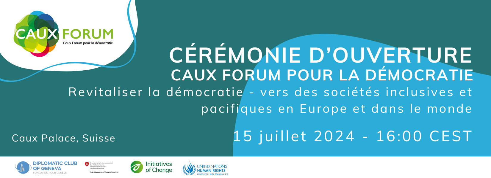 La cérémonie d'ouverture du Caux Forum pour la démocratie est organisée par Caux Initiatives et Changement en partenariat avec Initiatives et Changement International, le Club diplomatique de Genève, le Département fédéral suisse des affaires étrangères (DFAE) et le Haut Commissariat des Nations Unies aux droits de l'homme.